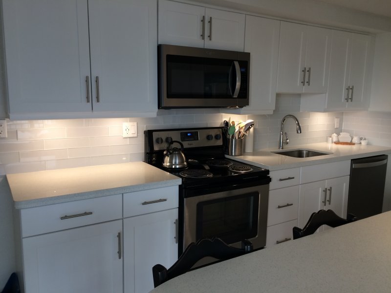 Renovated, all white kitchen with Stainless steel appliances, including dishwasher full-size range, and built in microwave